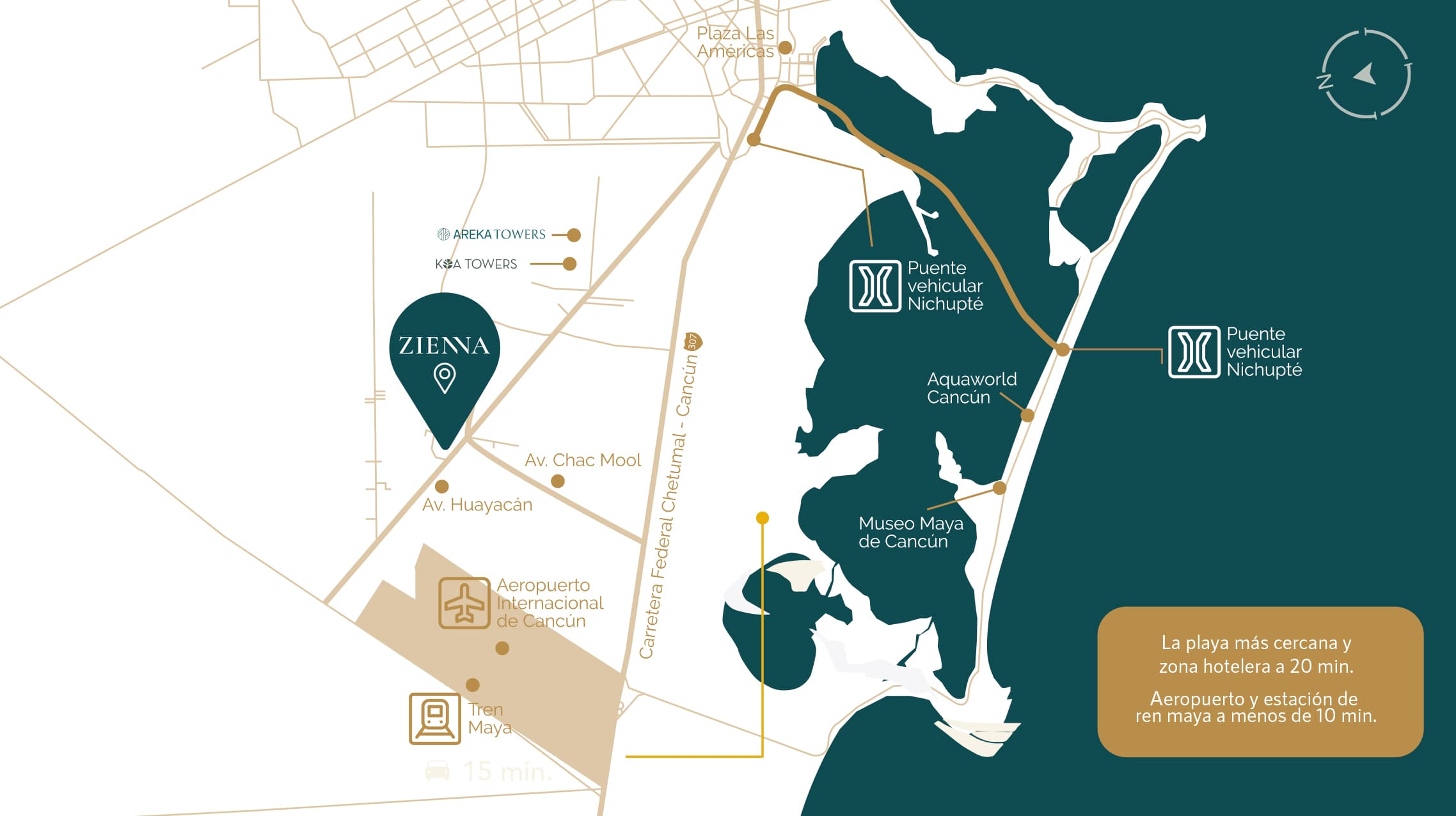 Ubicado a 20 minutos de la playa y la zona hotelera, y a menos de 10 minutos del Aeropuerto de Cancún y la estación del Tren Maya.
